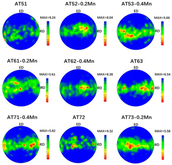 Figure 8 shows the (0001) pole figures of extruded Mg-Al-Sn-Mn magnesium alloys; the as-extruded alloys exhibit a typical extruding texture with (0001) basal planes parallel to the extrusion direction (ED), which is a typical fiber texture in extruded magnesium alloys [36,48]. In addition, the maximum texture intensity varies with element content. The orthogonal test parameters and results analysis are shown in Table 2.