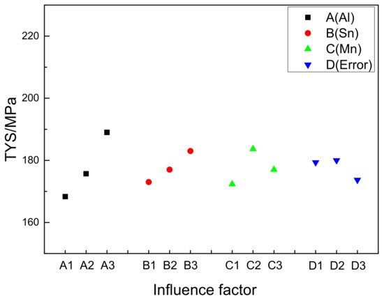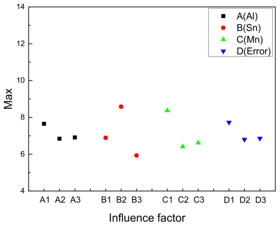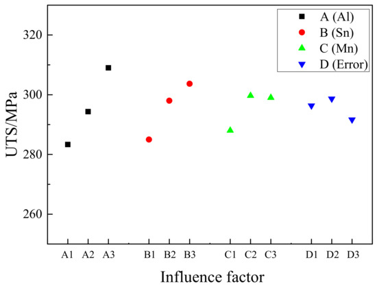 In order to understand the influence of Al, Sn and Mn content on UTS of the extruded Mg-Al-Sn-Mn magnesium alloy, the diagram of the relationship between factors and indicators (UTS) is shown in Figure 11.