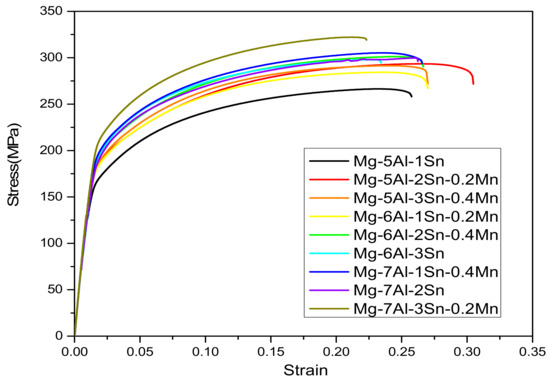 The stress-strain curves of the extruded Mg-Al-Sn-Mn alloy.