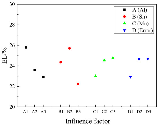 Similar to the analysis of the strength index, it can be concluded from Table 6 that the R value ranks in the order of R(B), R(A), and R(C). The Sn content has the greatest influence on the elongation, and the R value is 3.47. The second is Al, and the content of Mn has the smallest effect on the elongation. The reason is that the addition of Sn to Mg alloys can decrease the stacking fault energy of the alloys, resulting in the improved activity of basal slip system {0001} <110> and the activation of the {101} <110> and {112} <113> slip systems [30]. So, the addition of Sn makes the elongation increase. However, when excessive Sn is added, Mg2Sn hinders the movement of dislocation, resulting in the increase of the strength and decrease of the elongation. The Al element is completely dissolved into the matrix, resulting in lattice distortion. The increase of the Al content leads to the increase of lattice distortion. Then, it leads to the increase of the strength and decrease of elongation. The addition of Mn can effectively refine the grain size, leading to strength and elongation increasing at the same time.