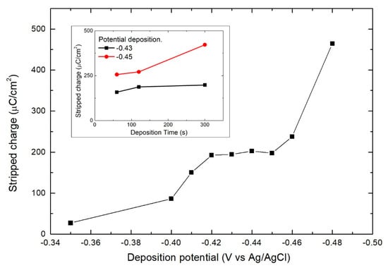 Successively, we proceeded with a systematic study to find the best conditions for the SLR deposition of the metal. Bi depositions were carried out for one minute by varying the potential between −0.35 V and −0.48 V and then the deposit was anodically stripped in an EDTANa2 solution to evaluate the actual deposited amount (Figure 2). With increasingly negative stripping potentials, the charge increases, since the deposition time is not sufficient to deposit an entire monolayer of the metal, down to −0.42 V. However, at a potential more negative than −0.45 V, the charge grows very quickly indicating the onset of massive deposition. The optimal conditions for SLR deposition are most likely within the plateau between −0.42 V and −0.45 V. For further confirmation we repeated the depositions at −0.43 V and −0.45 V by varying the deposition time (inset in Figure 2). While at −0.43 V, the charge remained essentially constant, increasing the deposition time. At −0.45 V, the deposit tended to grow, indicating a slow deposition of massive Bi. For this reason, −0.43 V represents the optimal potential for the SLR deposition of Bi on Se.