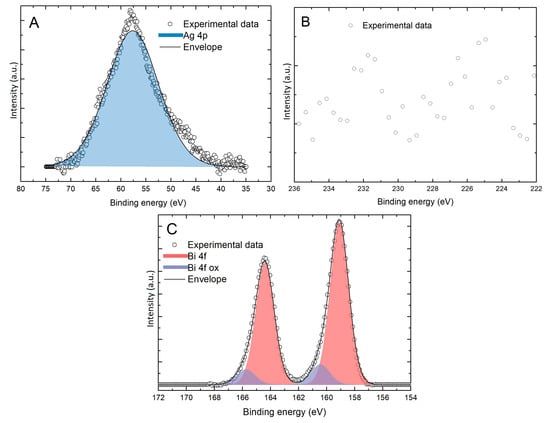 XPS peak of (A) 3d transition region of Se (not present) and Ag 4p; (B) 3s transition region of Se (not present) and (C) 4f transition region of Bi in the sample prepared performing 20 deposition cycles.