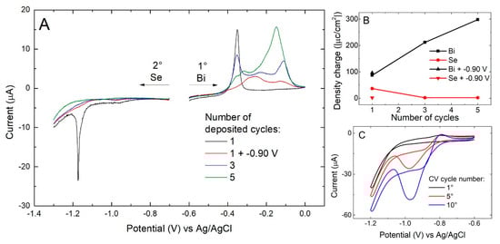 (A) Stripping of the Se/Bin, with n equal to the number of the cycles performed (from 1 to 5), first removing the metal and then the non-metal element, 10 mV/s scan rate; (B) charge calculated integrating the stripping curves; (C) consecutive CVs cycles of selenite on bulk Bi: 1st black, 5th red, 10th blue, 50 mV/s scan rate.