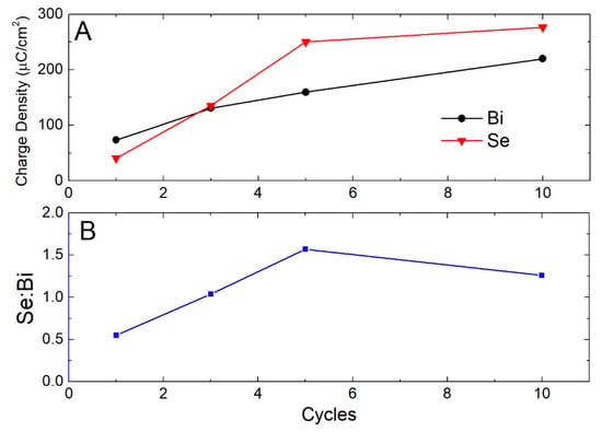 After performing further experiments, it emerged that, although it was not possible to deposit SLR layers of Se on Bi, the deposition of massive Se remained unaltered and did not interfere with the already deposited underlying Se. This behavior is probably due to the fact that bulk Se is deposited at a lower potential (−0.8 V), without occurring in the reduction and desorption of the underlying layers. In order to deposit an amount of massive Se equivalent to the amount of a Sead we found that the potential should be kept at −0.8 V for around 3 min (time-controlled deposition). Deposits up to 10 cycles were thus made (Figure 5) and subsequent stripping confirms the presence of both elements. From these measurements we can also obtain a preliminary quantification of the Se:Bi ratio which is close to the stoichiometric value of 3:2. Slight variations are reasonalbly due to the uncontrolled nature of the massive deposition.