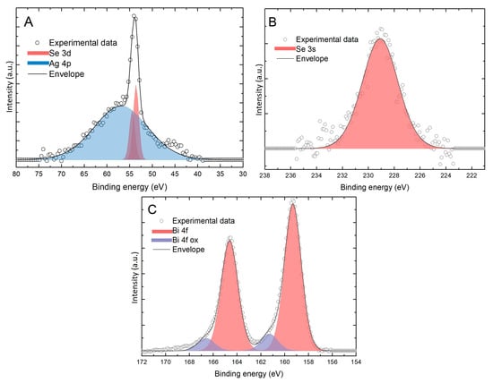 XPS peak of (A) 3d transition region of Se and Ag 4p; (B) 3s transition region of Se and (C) 4f transition region of Bi in the sample prepared performing 20 deposition cycles with the time-controlled bulk Se deposition method.