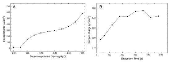 (A) Growth of the amount of Bi deposited in one minute on Ag electrode in function of the deposition potential; (B) amount of deposited Bi with a potential fixed at −0.45 V depending on the deposition time.