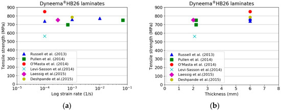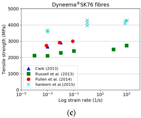 Tensile strength of Dyneema®HB26 laminates as function of: (a) Strain rate; (b) Thickness; (c) Tensile properties of Dyneema®SK76 fibres.