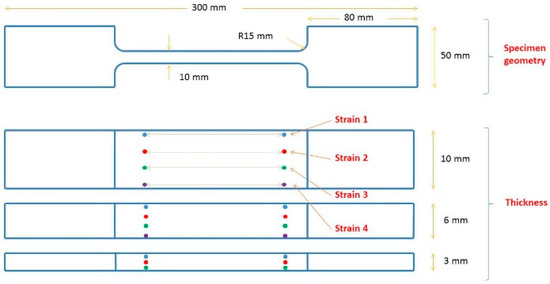 In this study, the tensile properties of Dyneema®HB26 laminate having different thickness of 3, 6, and 10 mm were investigated. The laminates were manufactured by DSM via the hot-pressing technique, which curing profile is proprietary. Dog-bone specimens (Figure 4) were waterjet cut from the as-supplied laminates. Quasi-static tensile tests were performed at room temperature using an Instron 5985 universal testing machine equipped with a 250 kN load cell, having an accuracy of ±0.5% of the displayed force. Specimens were clamped using hydraulic grips equipped with flat serrated jaw faces operated with a maximum pressure of 180 bar. Tests were performed at different cross-head displacement speeds of 1, 5 and 10 mm/min. The strain was measured using a video extensometer (Imetrum Video Extensometer) by tracking the relative displacement of three or four points marked along the thickness of the specimens within the gauge length, as shown in Figure 4.