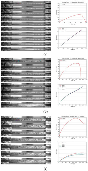Snapshots from tensile tests and force and time history plots for Dyneema®HB26 laminates with different thickness: (a) 10 mm; (b) 6 mm; (c) 3 mm.