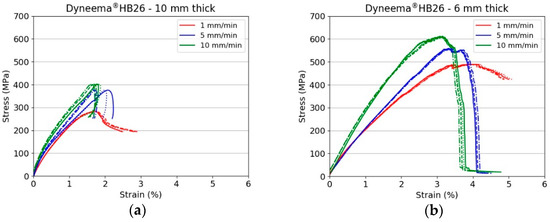Stress vs. strain curves for Dyneema®HB26 laminate with different thickness: (a) 10 mm; (b) 6 mm; (c) 3 mm.
