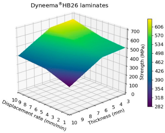 Tensile strength of Dyneema®HB26 laminates as function of thickness and displacement rate.