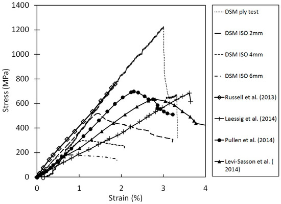 The experimental results indicate that, for a fixed thickness, the tensile strength of the laminate increases with increasing the testing speed. While, for a constant test rate, the strength decreases with increasing the specimen thickness. However, evaluating the results plotted in Figure 7, it is possible to note that the maximum tensile strength for the 10 mm specimens ranged between 282 and 401 MPa amongst the investigated testing speeds. These values are well below the theoretical strength of the material in a laminate form (1411 MPa, considering the tensile strength of the fibres to be 3400 MPa and the laminate fibre volume fraction of 83%) and below the values reported in previous published works (Figure 2a,b). The tensile strengths for 6- and 3 mm thick specimens were as high as 539 and 638 MPa, respectively, when tested at the highest investigated displacement rate. Nevertheless, even for the thinnest specimen tested at 10 mm/min, it was not possible to match the values reported in the literature due to the difference in the specimen geometry and specimen preparation. The results are compared with a detailed review performed by DSM in Section 4. The strong dependency on the thickness is shown in Figure 8 [19].