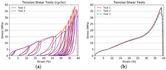 Tensile stress-strain relationship for tension shear specimen. (a) Cyclic tests; (b) Monotonic tests.