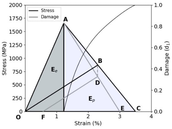 where n represents the nth timestep or load increment. Figure 12 illustrates the bilinear constitutive model where AC relates to and AE, when . The greater the value of , the greater the magnitude of the irreversible stress BD, and hence the permanent strain OF. The “plastic strain” that is defined in this paper results from residual deformation formed during damage evolution. It is clear that the constants can be derived from experimental fibre cyclic permanent strain versus damage plots.