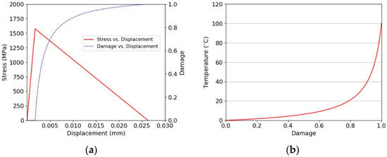 By equating the external work, Equation (14), to the internal work, Equation (17), the adiabatic system is completed defined. The approaches are defined in such a manner that the damage evolution reaches 1 when the temperature also reaches the softening temperature. At this point, the integration point, and hence element, is removed within the Finite Element analysis indicating tensile failure has occurred. This is required to prevent excessive drawing of the finite element which has failed.
