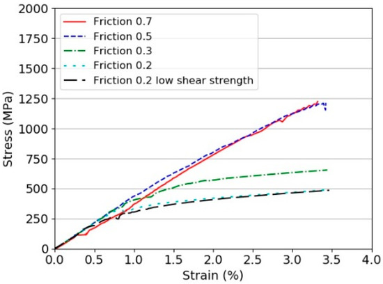 Virtual tensile testing of a Dyneema®HB26 laminate specimen (thickness 10 mm) with different static and dynamic frictional coefficients.