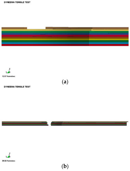 The sensitivity parameter within the contact interface was the dynamic and static friction coefficients, which would indicate the ability to continue to transfer the load once a layer unloaded, due to failure, was very important. Ideally the frictional coefficients used with the interface could be made a function of rate, temperature, both ambient and interface generated, and confining pressure. This is not available in ls-dyna, but could be implemented via a user-defined interface. It is believed that the interfaces are critical in transferring the load between layers. It also is believed that such an approach can be used to optimise the interfaces for ballistic impacts. Figure 18a shows a typical failure when the core plies cannot be failed, while Figure 18b,c present the deformation for complete failure. It can be clearly seen that all plies are not uniformly loaded and the progressive nature of the failure results in the lower strengths compared with the expected strengths based on simple theory of mixtures.