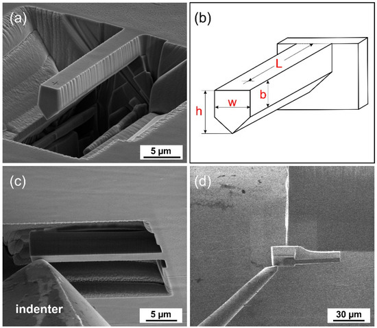 - Ast, J.; Przybilla, T.; Maier, V.; Durst, K.; Göken, M. Microcantilever bending experiments in NiAl–Evaluation, size effects, and crack tip plasticity. J. Mater. Res. 2014, 29, 2129–2140. [Google Scholar] [CrossRef]