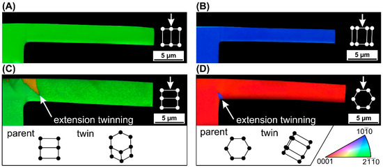Figure 2 shows the EBSD analysis of the longitudinal sections of the cantilever samples. The results are presented by IPF (inverse pole figure) maps combined with IQ (image quality) maps. The basal plane orientations A and B show no slip or twinning mechanism in the volume. The pyramidal slip should be the favorable deformation mechanism but higher stresses are needed for its activation. The prismatic plane orientation C reveals extension twin {10-12} in the tension zone near to the fixed end. The prismatic plane orientation D exposes extension twin {10-12} in the compression zone near to the fixed end. Extension twinning results in the reorientation of the original lattice of the microcantilever by an angle of ~86°.