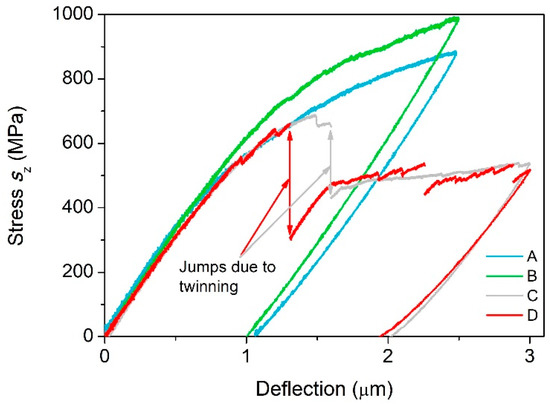 Figure 3 shows the maximum tensile stress due to bending, sz, versus deflection for samples A, B, C, and D (z is the longitudinal axis of the microcantilever). Stress sz was obtained from formula 2 from a past paper [24] (s = PLy/I). The curves associated with samples A and B show high stresses and no stress drop. On the contrary, the curves associated with samples C and D display lower stresses and a significant stress drop suggesting ongoing twinning deformation mechanism.