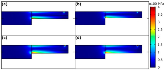 Von Mises stress distribution (in MPa) in the vertical mirror plane of microcantilevers A–D (a–d), respectively. Cantilever deflection equals 0.4 μm.