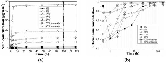 Figure 1. Nisin release from the PVA films after immersion in physiological solution, analysed by RP-HPLC: (a) cumulative concentration in µg/mm2 and (b) related to total released amount.