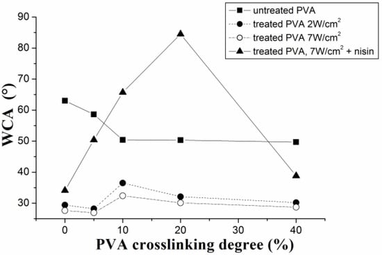 Figure 3. The water contact angle dependence as a function of PVA crosslinking degree; plasma treatment time was 10 s. Nisin was attached from PBS buffer.