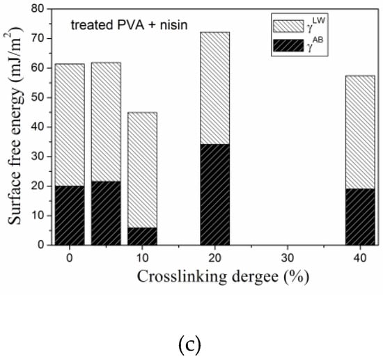 Initial concentration of nisin (that was measured during nisin release) corresponded to nisin adhesion on PVA films, and it is in agreement with WCA measurements (Figure 4). The hydrophilic character (wettability) of PVA films significantly increased after the plasma treatment (see Figure 3 and Figure 4). The γAB component of surface-free energy increases with plasma treatment, which indicates the presence of polar groups (attached via covalent bonds). Furthermore, the total surface energy increases, which enables nisin adhesion. With nisin immobilization on the surface, the γLW increases, thus the van der Waals interactions predominate. The different trend (WCA increase) with nisin adhesion demonstrates increase of contact angle, suggesting the hydrophobic nisin groups’ attendance. While non-crosslinked PVA films and films with low crosslinking degree up to 5% show only slightly decreased wettability in comparison with untreated PVA films, samples with higher crosslinking degree (10 and 20%) show significant increase in WCA. This increase can be also caused by the surface roughness. With further increasing of crosslinking degree, the steep decrease of WCA was observed. This phenomenon can be explained by lower presence of free hydrophilic groups (OH, COO–) on the PVA surface, as was also confirmed by the previous study [45]. Maximal WCA of 84° was obtained for PVA with 20% of crosslinking. This can be attributed to protein surface adhesion when nisin was bonded to PVA substrate. It also reveals the optimal PVA crosslinking degree for the protein efficient surface immobilization. These results are in agreement with those in Section 3.1 and Section 3.2.