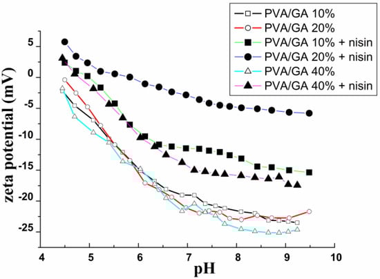 Figure 5. Zeta potential of treated PVA films with different crosslinking degree with and without adsorbed nisin as a function of pH values. Titration was performed by using 0.05 M NaOH. Non-crosslinked films and films with crosslinking up to 5% were not measured due to their low resistance to electrolyte.