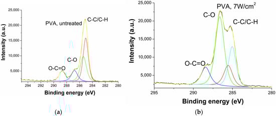 Figure 6. C1s high resolution peak fitting of (a) untreated PVA (0% crosslinking) and (b) plasma treated PVA (0% crosslinking).