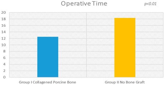 There was statistically significant difference in the surgical time required to complete the augmentation procedures: 18.3 ± 2.1 min for lamina treated sites versus 12.5 ± 3.1 min for porcine bone treated sites (Figure 1 and Figure 2), which is significantly greater in the non-grafted sinus one (5.1; 95% CI: 3.7430–7.8570; p < 0.01).