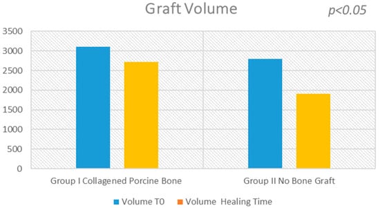 The statistical analysis showed a significant difference of volume change before and after sinus lifting (p = 0.001229) for each group. A small statistical difference was found in the volume change between sinus lifting and after six months healing in Group I (−384.300 mm3, 95% CI; −679.9703 to −88.6297; p = 0.0165). A large statistical difference was found in the volume change between sinus lifting and after six months of healing in Group II (−888.900 mm3, 95% CI; −1106.1932 to −671.6068; p < 0.01).