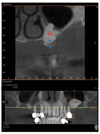 Group I. Six months after sinus lifting. CBCT image showing reduced bone height in the sinus area with a residual alveolar ridge height between 1 and 3 mm (arrows) and bone graft (BG).