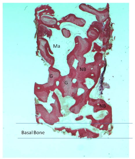 The histological results showed new bone percentages in both groups. A statistically significant difference was evident in the percentages of bone formation (7.0%, 95% CI; 8.2656 to 5.7344, p = 0.006) and a large difference was present in the percentages of marrow space (31.320%, 95% CI; −32.8548 to −29.7852, p = 0.000001). The histomorphometric results showed that, at the observed time, the amount of marrow spaces and residual graft material more than new bone formation are always quite different from 100%, which is because the three measurements were carried out individually with a margin of error, thus the sum of the error includes measurements in the graft, bone, and woven bone and marrow spaces.