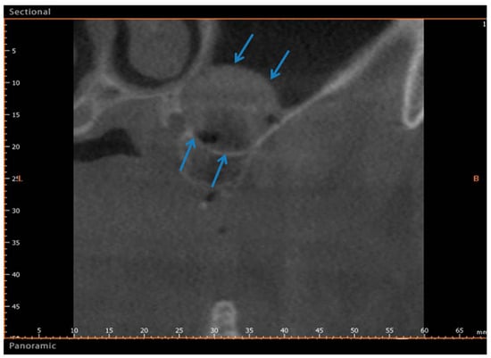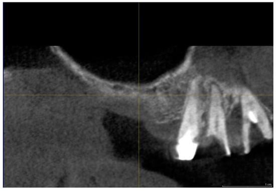 A total of twenty-three healthy subjects with non-contributory past medical history (14 women and 9 men, all non-smokers, mean age 52 years, range 48–65 years) were included in this study where a total 28 maxillary sinuses were treated. The candidates were selected for sinus augmentation in the posterior maxilla in order to receive implant supported rehabilitation, and signed a written informed consent. The surgery was performed in the Outpatient Department of Oral Implantology, Center for advanced studies, Dental Research Division, UNINGÁ-Cachoeiro de Itapemirim, Brazil. A total of 18 patients were treated for unilateral sinus augmentation, while in 5 patients the procedure was bilateral for a total 28 surgical sites. Moreover, the sites were randomly allotted into two different groups, with 14 sinuses each, and the procedures were performed by a single surgeon. The inclusion criteria provide for fully edentulous or partially edentulous subjects affected by unilateral or bilateral loss of teeth in the maxillary premolar or molar areas with a severe alveolar atrophy and a residual bone ridge height between 2 and 3 mm. The exclusion criteria were severe illness, head and neck radiation therapy, chemotherapy, uncontrolled diabetes or periodontal disease, smoking, sinus pathology, or presence of a residual root in the maxillary sinus. At the initial visit, all subjects underwent a clinical and occlusal examination, and panoramic radiographs were evaluated. A three-dimensional radiographic tomography scan (CBCT) (Vatech Ipax 3D PCH-6500, Fort Lee, NJ, USA) was performed before the procedure on the subjects to evaluate any clinically relevant and radiographically evident pathologies such as mucosal thickening, allergic or odontogenic sinusitis, mucus-retaining cysts, partial to complete sinus obliteration, oroantral communications, antroliths, mucoceles, and mucopyoceles (Figure 3, Figure 4, Figure 5 and Figure 6). In this way, CBCT was also able to analyze the patency of the ostium and the osteomeatal complex. After a thorough preliminary examination, patients were elected for bone regeneration procedure including sinus augmentation and implant insertion. Preoperatively, they were extensively informed concerning the surgical procedures.