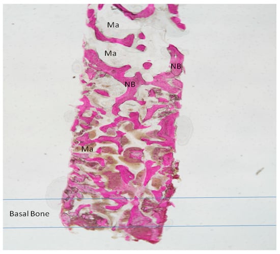 Group II. New Bone trabeculae (NB) were seen throughout the large marrow spaces (Ma). The basal bone with a small marrow spaces. Acid fuchsin and toluidine blue 4X.
