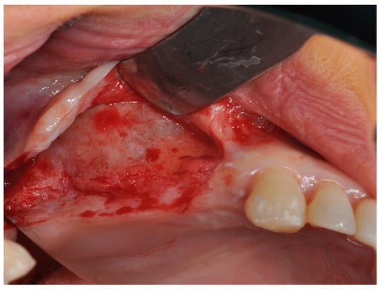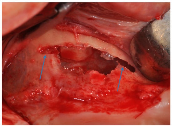 Prior to surgery, the subjects’ mouths were rinsed with a chlorhexidine digluconate solution 0.2% for 2 min. Local anesthesia was performed by Articaine® (Ubistesin 4%-Espe Dental AG Seefeld, Germany) with epinephrine 1:100.000. A modified triangolar flap without anterior release, recently described by Scarano et al., was used [32]. In edentolous cases, the incision was performed on the top of the alveolar ridge horizontally and extended mesially, while, in other cases, the incision was intrasulcular starting near the mesialbuccal edge of the teeth and then extended up to the midpoint of the buccal sulcus of the canine, preserving the dental papilla (Figure 8) [32]. A full thickness flap was elevated to approach the lateral wall of the maxillary sinus and a trap door was made by piezoelectric unit device (Piezosurgery, Mectron, Carasco, Italy) under cold (4–5 °C) sterile saline irrigation to approach the lateral sinus wall with a mesio-distal measure of 6 mm and an apico-coronal height measure of 6 mm, starting from 2 mm from the crestal side; then, the bony door was removed (Figure 9). The elevation of the sinus membrane was accomplished by initially exposing and mobilizing the membrane using the ultrasonic handpiece followed by hand instrumentation to further elevate the membrane along all the walls of the sinus, and then it was elevated by dedicated curettes of different shapes, until it became completely detached from the lateral, inferior, and medial walls of the sinus.