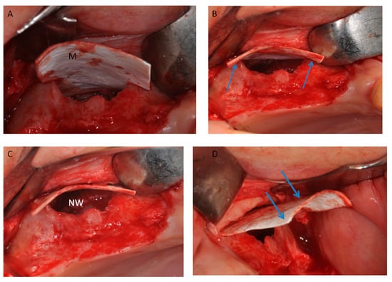(A) Half of the heterologous membrane was positioned on on the top of wall. (B) The lamina was adapted on the two lines (Arrows); and (C) pushed to the nose wall of the sinus (NW). (D) Half of the heterologous membranes external of the sinus (arrows).