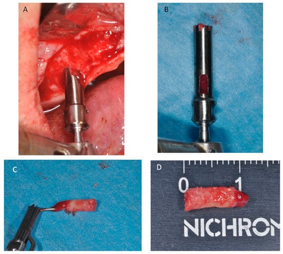 (A) After six months of healing a small trephine was used. (B) To retrieve a biopsy. (C) The bone core was removed from the trephine. (D) Bone core biopsy carried out.
