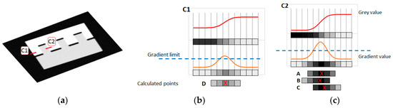 An approach different to the use of threshold values is to perform the detection or location of the surface based on the discontinuity or gradient. According to this approach, an edge or surface of an image is a significant local change in the intensity of the image that is usually associated with a gray level discontinuity. This principle allows the derivation of a single operator shape that is optimal at any scale. The optimal detector has a simple approximate implementation in which edges are marked at the maximum of a Gaussian-smoothed gradient function [16]. This type of technique uses local operators based on different discrete approximations of the first and second derivatives of the gray levels of the image. In metrological applications, it has been demonstrated that an algorithm whose development is based on the Canny algorithm provides reduced measurement deviations than an algorithm based on a dynamic threshold and is capable of offering similar or reduced measurement uncertainty [17].