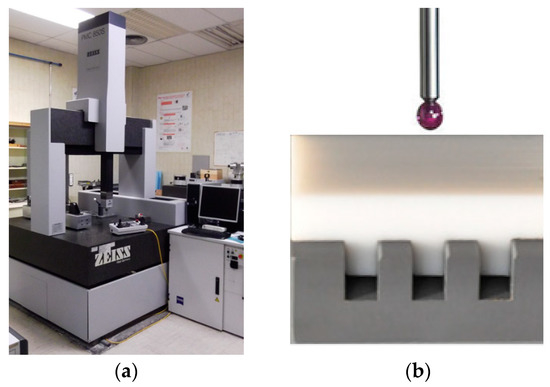 Two CMMs were used to calibrate the workpieces used in this study. The Step Gauge, the Lego, and the TEF-POM and TEF-PVC workpieces [28] were calibrated on a PMC 850S-CNC CMM (Figure 6) by Carl Zeiss (Oberkochen, Germany), which has a measurement volume of 850 × 700 × 600mm and a longitudinal MPE = 2.30 μm + (L/300) μm (L in mm). The probing system used was a Zeiss Vast-XT with an active scanner, allowing working with extensions of up to 500 g in weight and 500 mm in length.