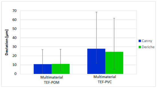 Figure 10 shows the results obtained in the multimaterial workpieces. In the measurement of the TEF-POM, the average deviation with the Canny-based surface extraction is only slightly lower (difference equal to 0.2 μm) than with Deriche-based surface extraction. For the TEF-POM, the maximum deviation with the Canny-based surface extraction is also slightly lower (difference equal to 0.3 μm) than with Deriche-based surface extraction. In the measurement of the TEF-PVC part, the average deviation and the maximum deviation with Deriche-based surface extraction are smaller than the same deviations with Canny-based surface extraction by 3.5 μm and 7.0 μm, respectively.