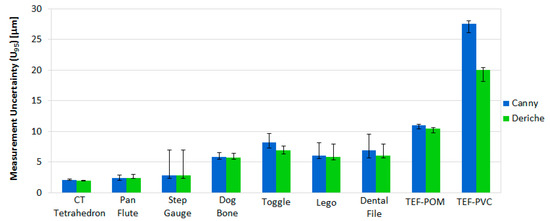 The average expanded uncertainty, taking into account all the part dimensions, is shown in Figure 11 by workpiece and in Figure 12 by type of measured geometry in each item. The error bars in both Figures represent the maximum and minimum expanded uncertainty of all the part dimensions for each part. As can be seen in both Figure 11 and Figure 12, Deriche-based surface extraction generally provides lower average, maximum, and minimum uncertainties U95 for each item.