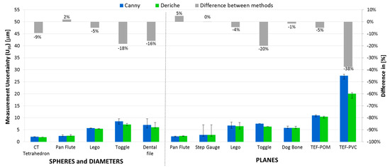 Most of the different uncertainty contributors considered in Equation (7) suppose a similar contribution in the expanded uncertainty for both Canny- and Deriche-based surface extraction. Nevertheless, the systematic error contribution (ub2) associated with the surface extraction method shows the largest difference between U95 obtained with Canny- and Deriche-based surface extraction. Additionally, ub2 constitutes 30% of U95, so a specific analysis was carried out and shown in Figure 13, where the contribution ub2 is represented for both methods for the two surface typologies.