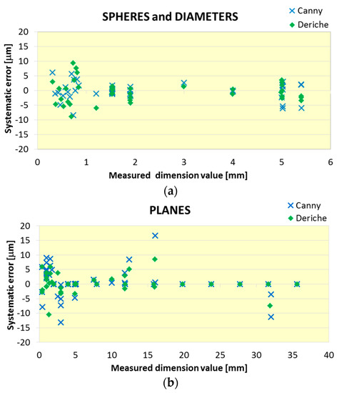 The average deviations with respect to the calibrated values do not present, in a general way, large differences for the two algorithms analyzed, with only a slight improvement in the Deriche-based surface extraction algorithm. However, a clear difference between curved and flat surfaces is concluded from this analysis: the reduction of the deviations obtained with the Deriche-based algorithm is evident, with reductions as large as 50% with the Deriche-based surface extraction for flat surfaces compared to the Canny-based algorithm. Similar results were observed in measurement uncertainty. The results of uncertainty obtained for the Deriche-based algorithm are further reduced in the dimensions defined by flat surfaces.