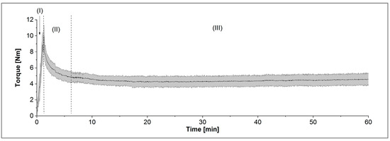 The composites of thermoplastic polymers and ceramic powders were prepared in a Brabender measuring mixer-kneader (W50 EHT, Brabender Instruments, South Hackensack, NJ, USA) as described in [29]. The temperature was set to 125 °C, and the mixing torque was recorded during the compounding time of 60 min. The curves can be divided principally into three sections: (I) the filling process, (II) the mixing and wetting state, and (III) the equilibrium state, as shown in Figure 2. The grey area shows the range of absolute values during a measuring period of two seconds. The latter delivers the final torque value, which can be treated as a first hint if the composite can be printed or not.