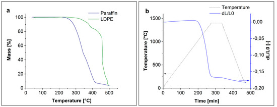 (a) Thermographimetric analysis (TGA) of paraffin and LDPE, and (b) TGA of dilatometer Al2O3.