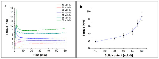 The powder agglomerates are destroyed during compounding, and the primary particles are dispensed homogenously in the polymer binder, observable by means of a smooth curvature during kneading (Figure 5a). The torque that the kneader needs to maintain the mixing speed depends on the solid content and the homogeneity of the materials. In Figure 5a,b are shown the torque profiles and the ending torque at 60 min mixing time.