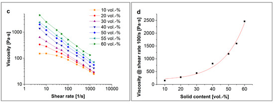 In Figure 5c, the rheological measurement over a broad shear rate range is shown. Like in the torque profile, the measurements of 10 and 20 vol % are different from the higher loaded samples. At very low shear rates, the zero viscosity (first Newtonian plateau) of the polymer binder system can be observed. However, all samples show pronounced shear thinning behavior, as expected in powder-filled polymer systems. Figure 5d shows the viscosity at a shear rate of 100 s−1, which is comparable to the printing shear rate in FFF. The viscosity increases exponentially more than one order of magnitude from 10 to 60 vol %.