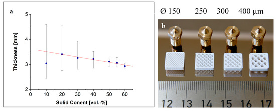 For exact printing results, the filament diameters must be within a very small tolerance range, as already observed in Section 2.3. The thickness was measured every 5 cm (10 points per filament) along 6–10 different filaments. The filament diameters decreased linearly with increasing solid content (Figure 6a). This can be explained due to the usual die swell of viscoelastic polymers. The higher the solid content of the material, the lower the polymer volume that swells at the end of the nozzle. With increasing solid content, the absolute errors (error bars in Figure 6a) and the standard deviations minimizes as well (Table 1).